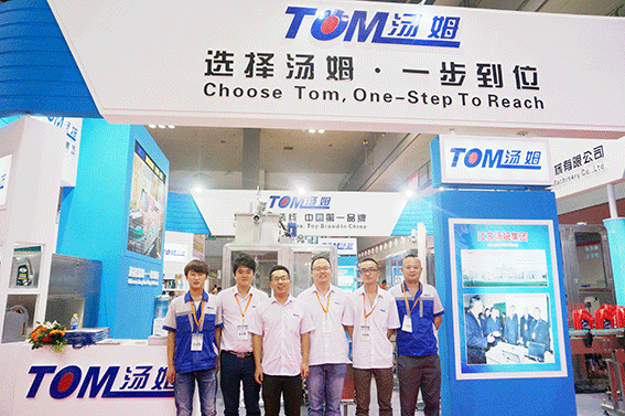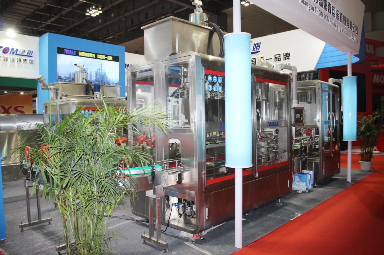 江蘇湯姆集團在展會現場展示了全自動稱重灌裝機、稱重式灌裝旋蓋一體機、快裝式全自動回轉式旋蓋機、廣口桶稱重灌裝機、廣口桶壓蓋機、噸桶稱重灌裝機、開箱機、裝箱機、封箱機、供棧機、抓桶碼垛機等多系列包裝機械產品。
