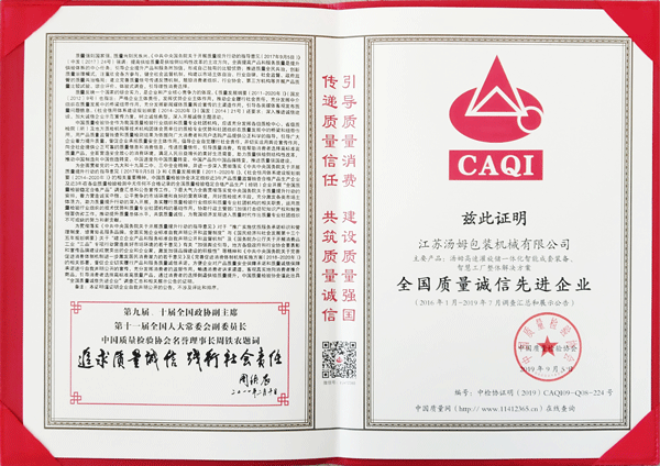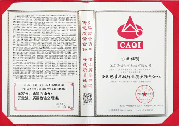 全國包裝機(jī)械行業(yè)質(zhì)量領(lǐng)先企業(yè)