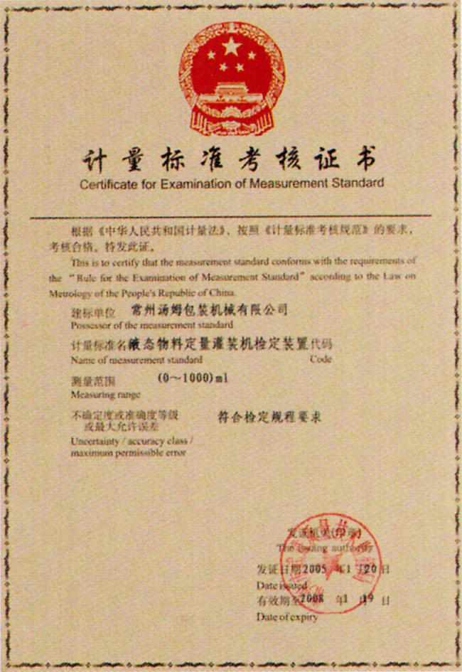 計(jì)量標(biāo)準(zhǔn)考核證書(shū)