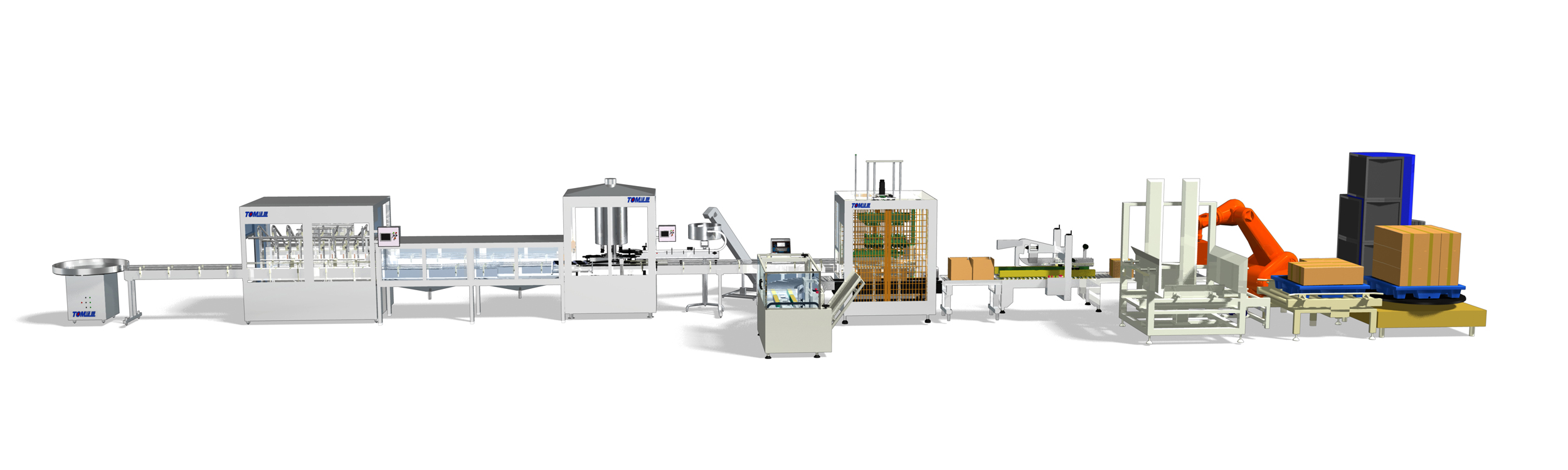 此條生產線設備配置:進桶機、全自動稱重式灌裝機、全自動封蓋機、噴碼機、開箱機、裝箱機、封箱機、機器人碼垛機、自動捆扎與纏繞機。
