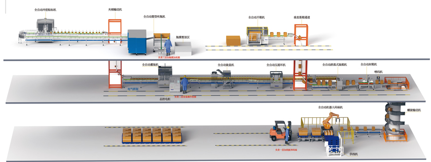 一樓:滾筒輸送設備、供棧機、全自動機器人碼垛機。